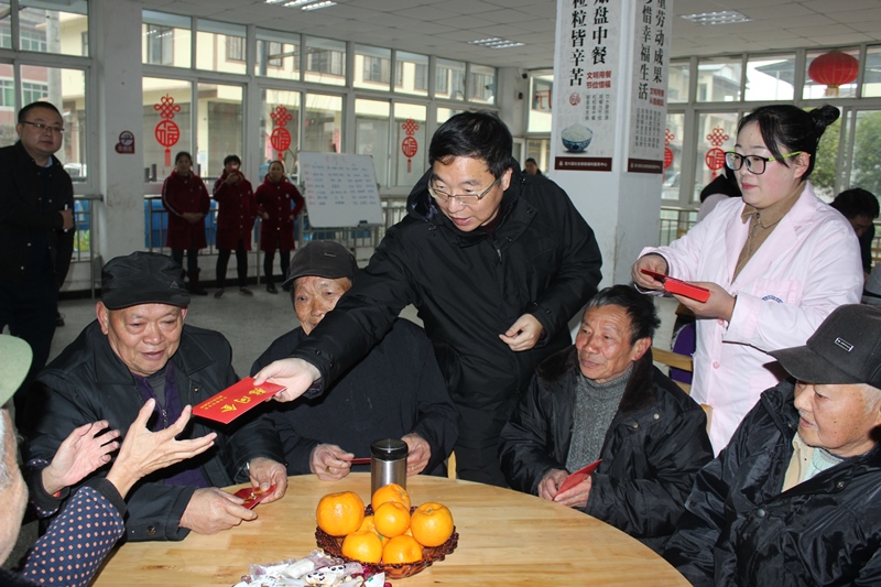 在宝兴县灵关镇中坝敬老院,杨兴品看望慰问了集中供养的五保老人,详细了解敬老院管理、服务等情况,为老人们送上慰问品和慰问金。