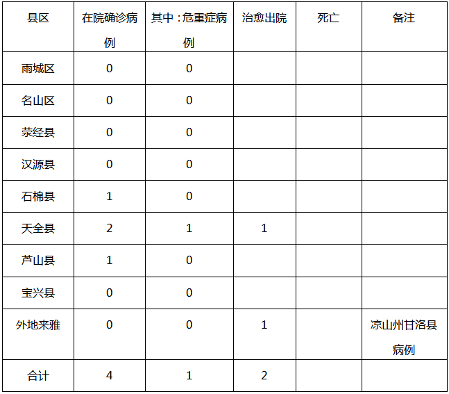 2月10日0-24时,雅安市无新增确诊病例。截至2月10日24时,雅安市现有新型冠状病毒肺炎确诊病例4例,均在接受隔离治疗。已治愈出院2例,在治危重症1例,其余病例病情稳定。