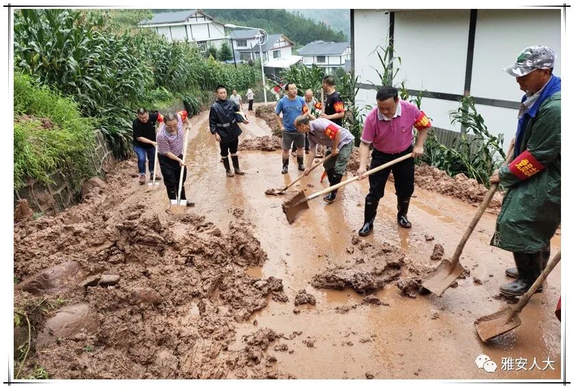 ▲8月12日,芦山县宝盛乡人大主席团组织20余名人大代表赶往受灾最严重的龙门镇王家村帮助群众清理门前院内和道路两旁的淤泥